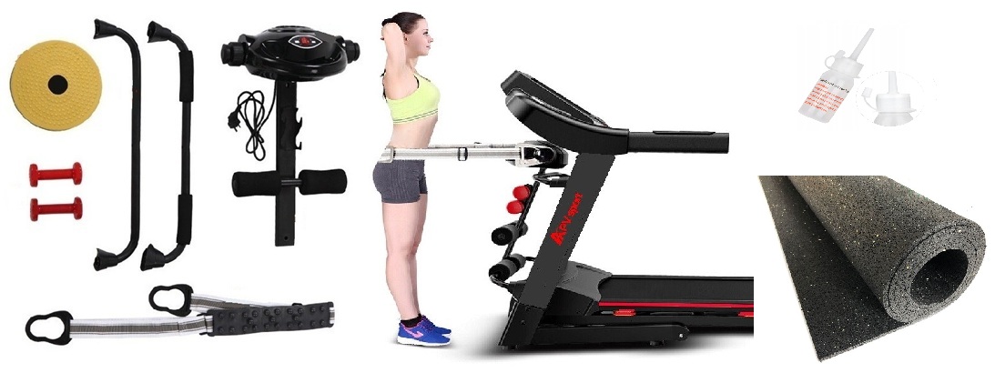 Zestaw: masażer, twister, 2 hantle, rama do robienia brzuszków z gąbkami, mata pod bieżnię, olej silikonowy do bieżni, model APV8000 →